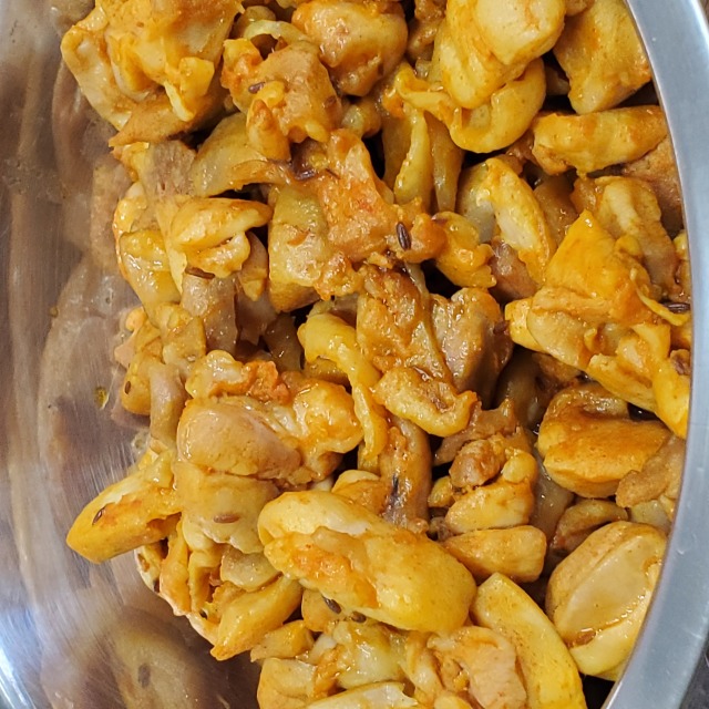 ②皿に盛付ける(米、鶏肉、ソースの順に出てくるよ)