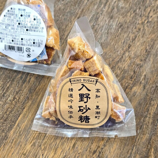 江戸時代からの歴史あるサトウキビ栽培と黒砂糖の加工技術を引き継いだ職人たちが、昔ながらの製法で丁寧に焚き上げた黒糖で、地元では地名から入野砂糖(いりのざとう)と呼びます。